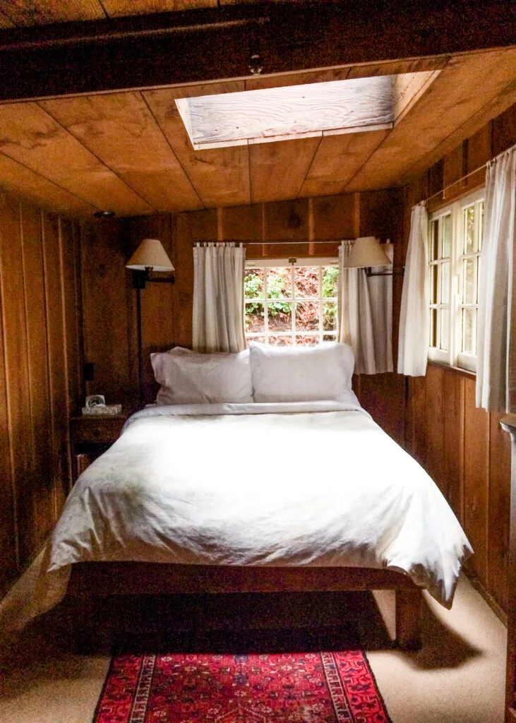 The room was comfortable and intimate and looked out into the lush redwood forest. It rained that night and we could hear the raindrops all night falling on the skylight above the bed.
