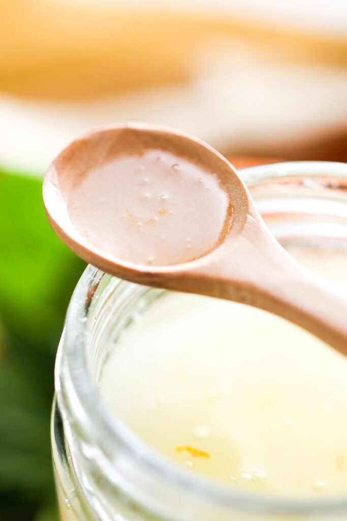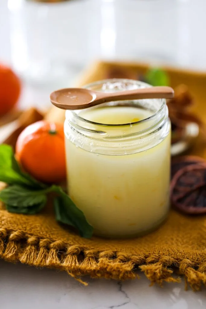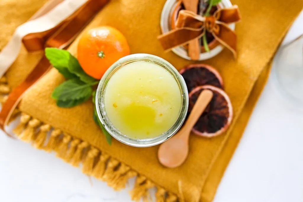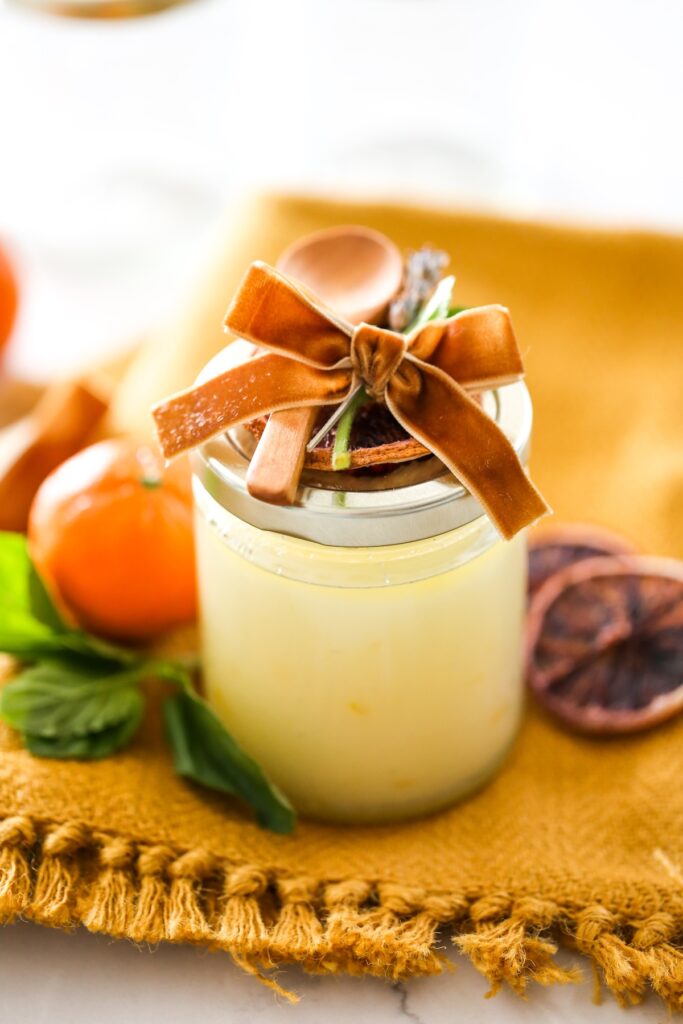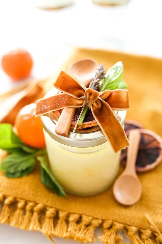 This Orange Mint Sugar Scrub makes a lovely handmade gift. Spoon it into a clear jar, add a simple label, and finish with a velvet ribbon bow, small wooden spoon, and a slice of dehydrated orange and a sprig of mint for a fresh, spa-inspired look.