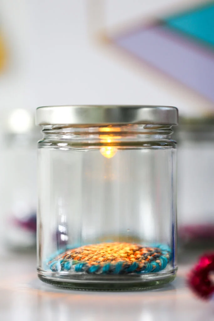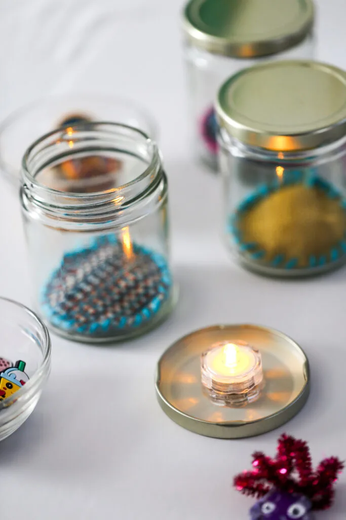 - Tiny twist-on fairy lights (battery-powered): to light up the inside like a glittery chandelier. Since they simply twist on and off, they’re easy to use. Simply hot glue the base to the inside of the jar lid before the party or have a designated teenager/adult manning a glue-gun station.