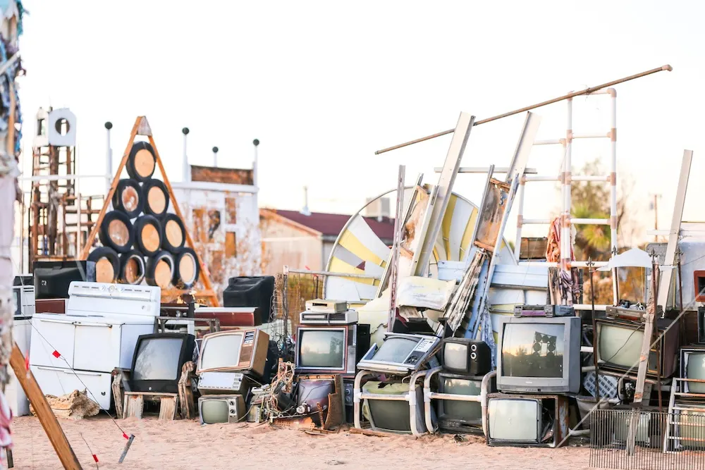- Carousel: Made from bicycle wheels, metal bars, playground parts, old computers, typewriters, and a desk chair, Carousel feels playful at first, but there’s something deeper going on. It nods to childhood rides and the idea of going in circles, but also hints at the repetitive cycles of life, labor, and social systems. Like much of Purifoy’s work, it walks the line between whimsical and thought-provoking, inviting you to look twice and maybe rethink what you’re seeing.