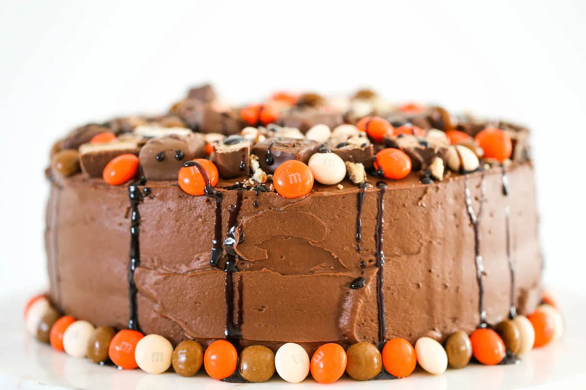 Do you always have candy leftover from Halloween or don’t want any candy leftover after Halloween? Then make this Leftover Halloween Candy Chocolate Cake! It’s a delicious, double-layer chocolate cake topped with a creamy chocolate buttercream frosting and covered with leftover chocolate Halloween candy. And, it’s perfect for a Halloween party or as dessert the day after Halloween!