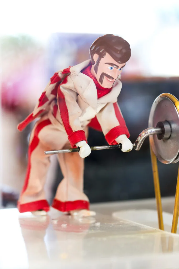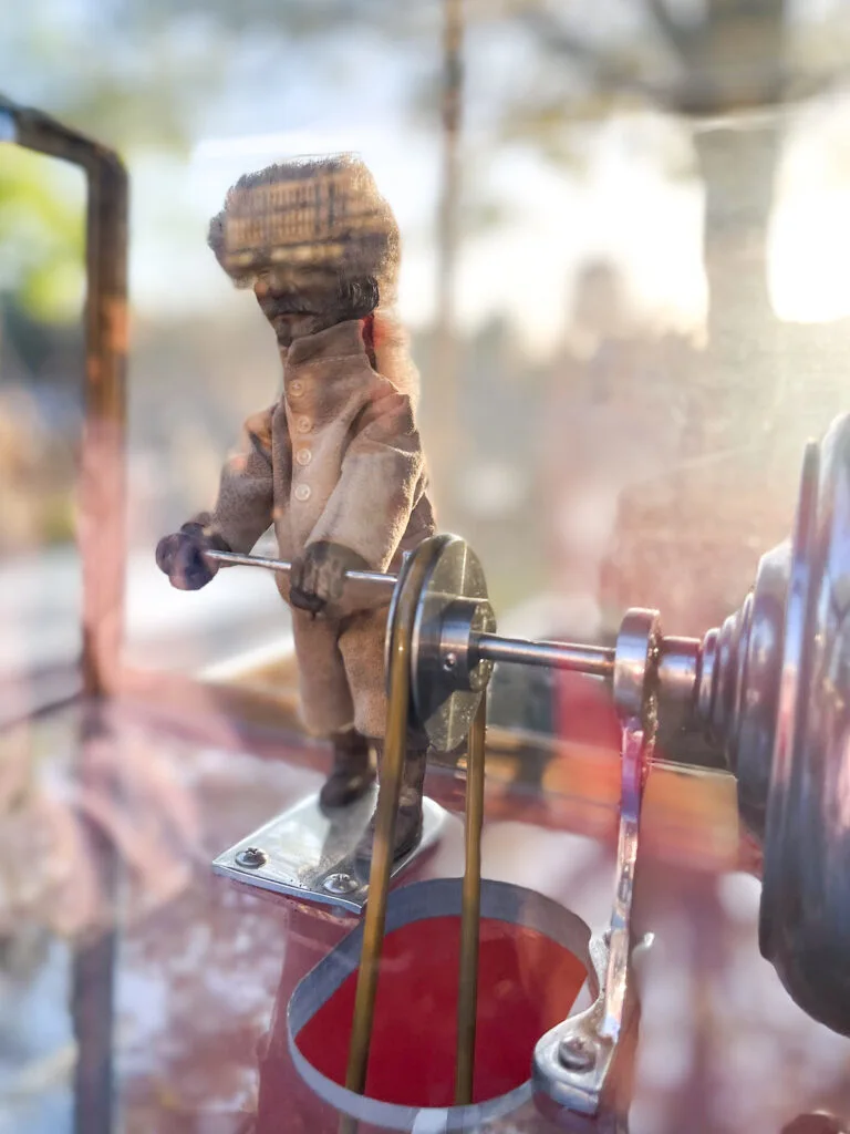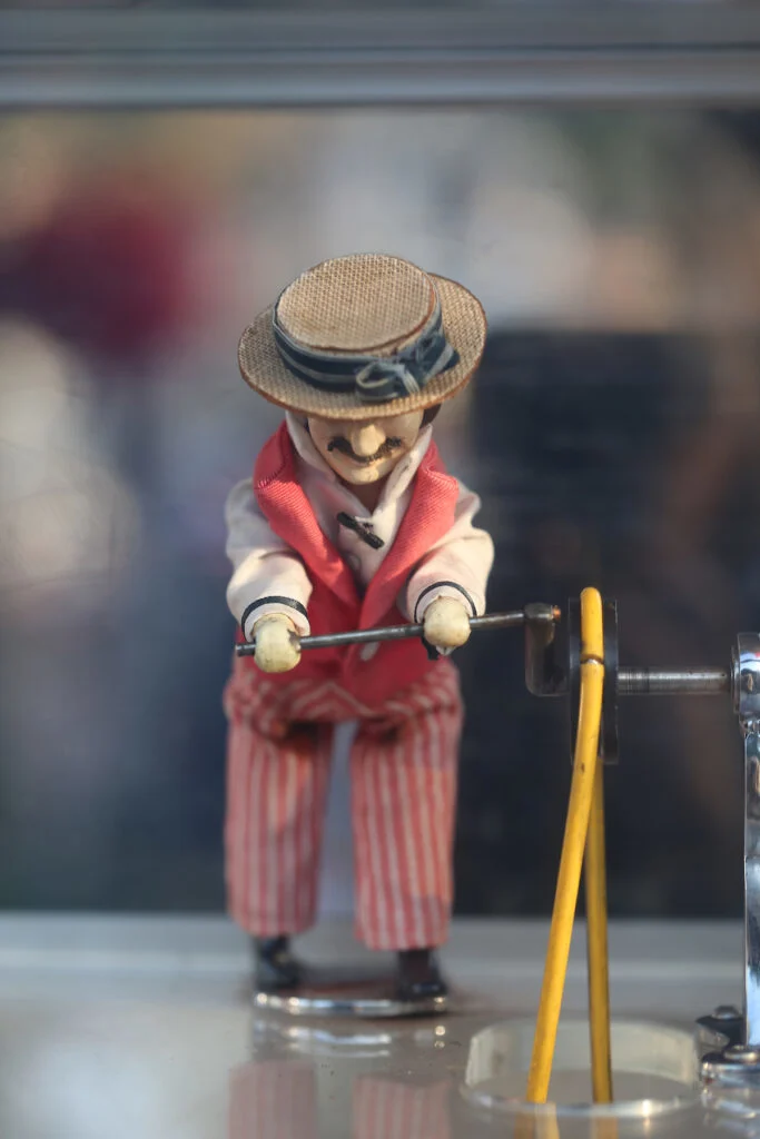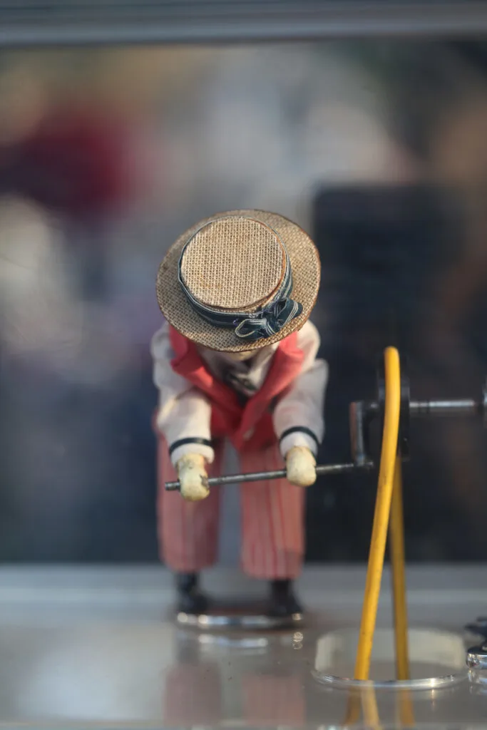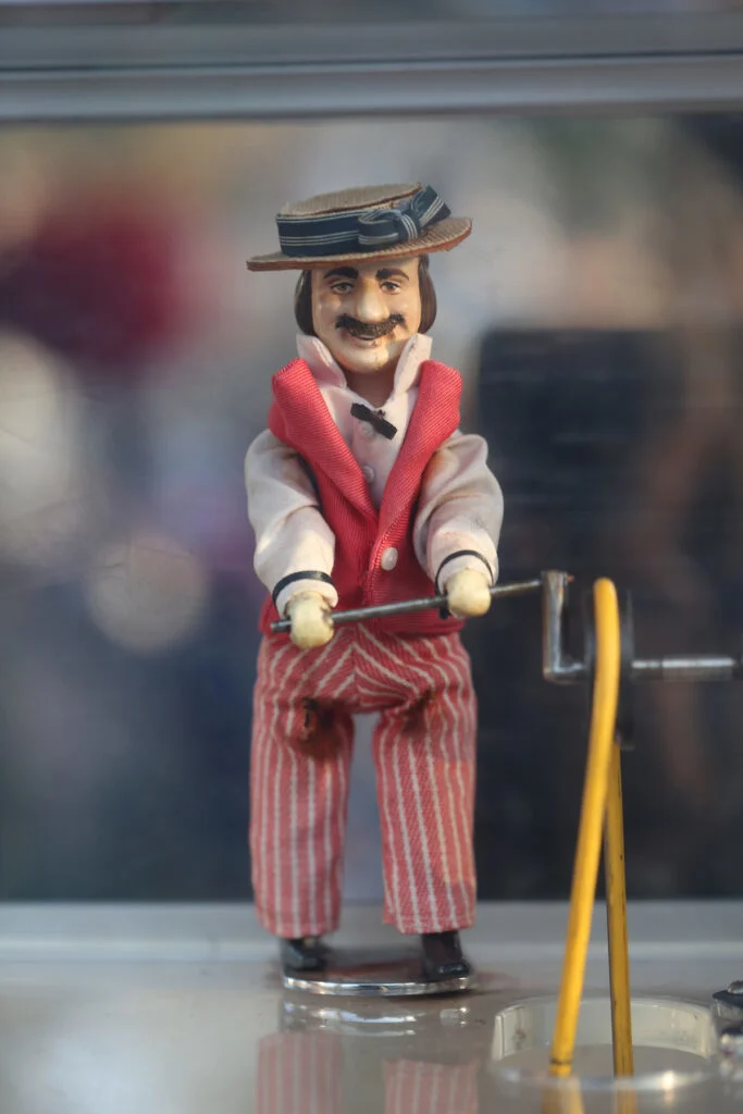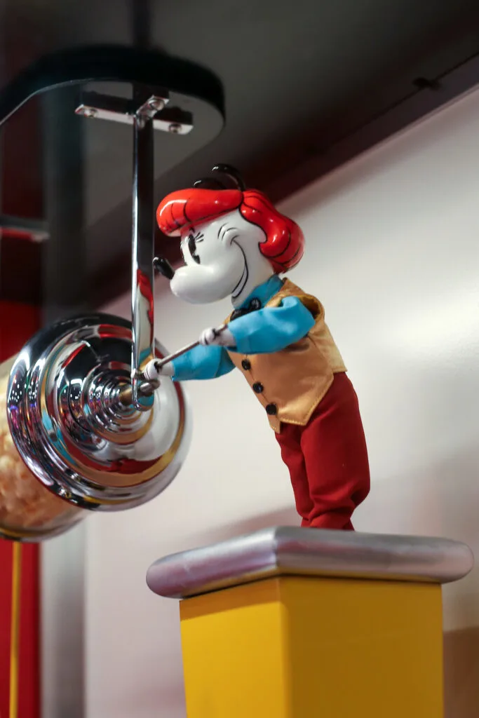 The mechanical popcorn-turner figure first appeared on peanut roasting carts made by Charles Cretors in the late 19th century. In order to draw customers, Charles Cretors added a small clown or figure, called the Tosty Rosty Man, that cranked a mixer or tumbler on those early steam-powered popcorn and peanut roasters. That same basic device, with the charming little character cranker, arrived in amusement parks and fairs and eventually found a perfect home in Disneyland.