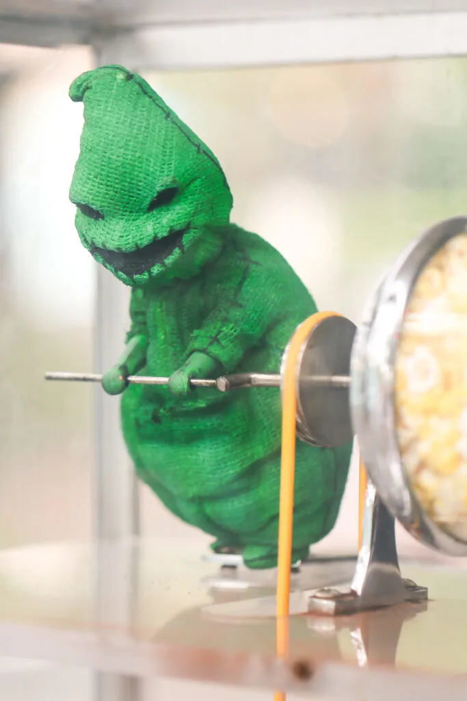 During the Nightmare Before Christmas overlay at the Haunted Mansion, the popcorn cart also gets a makeover and Ooogie Boogie appears as the popcorn turner.