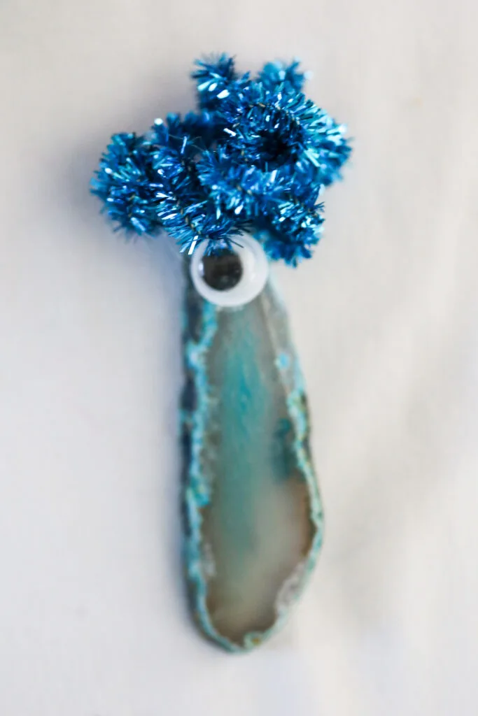 I made the pet rocks in advance, but had the girls been a bit older – maybe 9 or 10 years old – I would have had them make the rocks themselves. Each rock was a geode slice and had googly eyes and either pom balls or chenille pipe cleaners for hair.