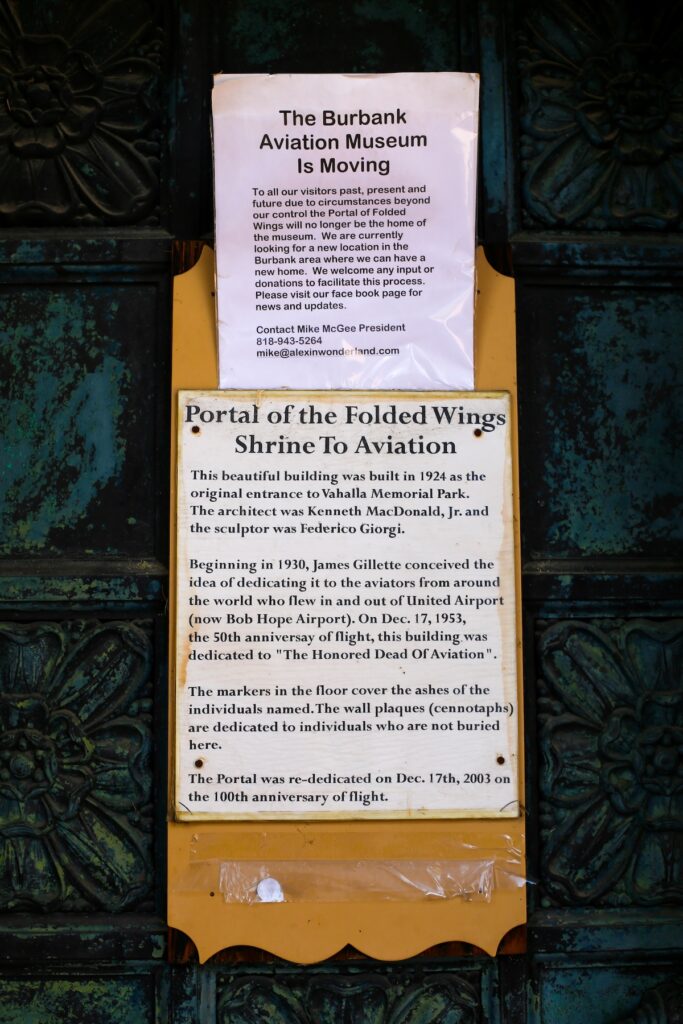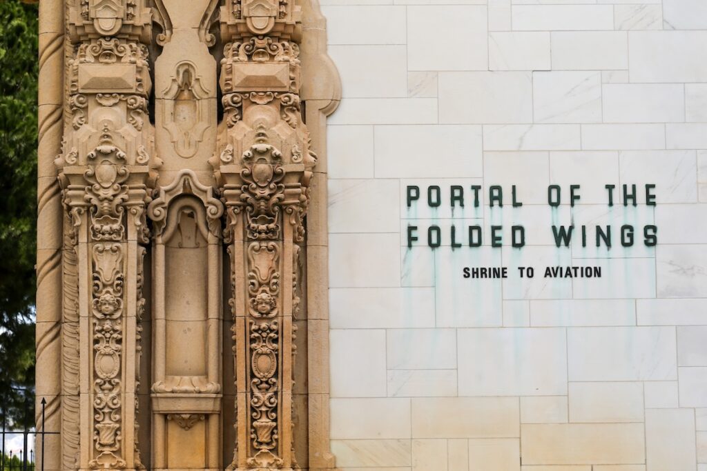 The Portal of the Folded Wing is a stunning aviation memorial located in Valhalla Memorial Park, paying tribute to pioneering aviators who shaped the history of flight.