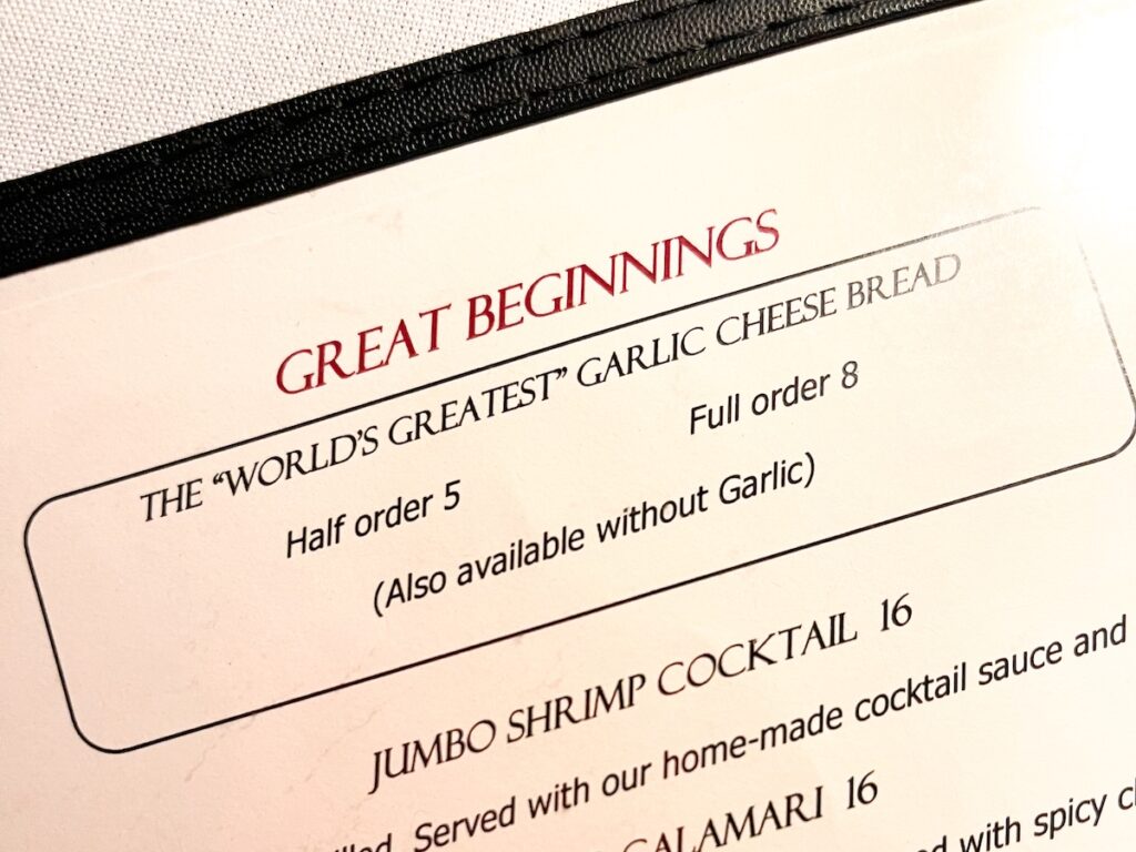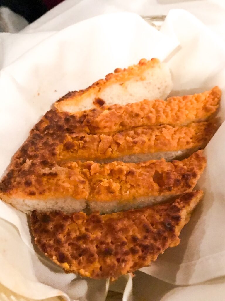 A note on “The World’s Greatest Garlic Cheese Bread” (their phrase, not mine). Please try it and report back your thoughts. My husband and I tried it and we were … disappointed. I mean, look at it. I don’t know. I don’t mean to shit on it, but they’re calling it the “World’s Greatest” and I couldn’t even take a second bite. I still highly recommend the restaurant, but the garlic bread is not on my recommendation list.